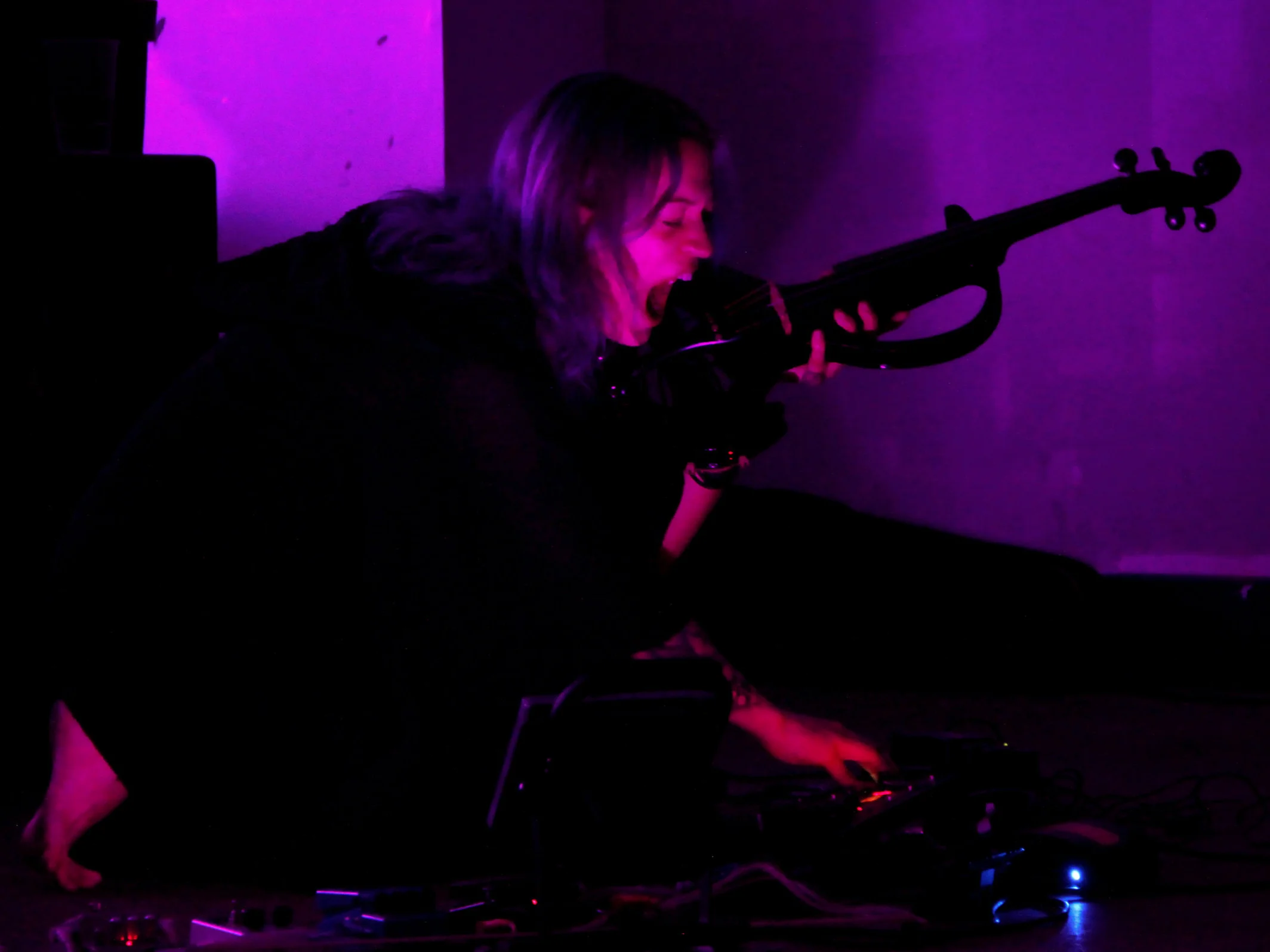 luxul is centered around the use of an electric viola, an array of effects pedals and the human voice to create a meditative, cacophonous and often chaotic output that is ritualistic and primal. Each performance is improvised and created from scratch often with minimal forethought, relying primarily on the feel of the moment and atmosphere of the location. In circumstances where it has been possible, props or entire set pieces have been utilised to enhance the subconscious narrative of the piece.